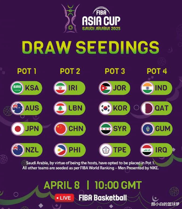 中国男篮的FIBA世界积分排名亚洲第6,被列入第二档,而东道主沙特阿拉伯自动进入第一档。