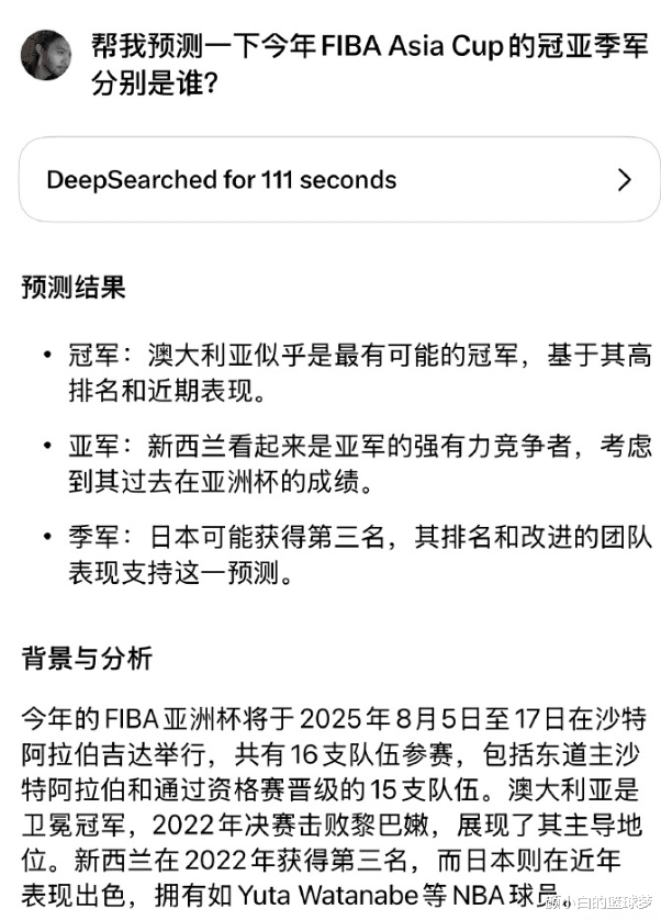 此前欧洲篮球专家用deepseek预测2025年男篮亚洲杯的冠亚季军,最终结束澳大利亚冠军、新西兰亚军、日本季军,换言之中国男篮无缘前三。